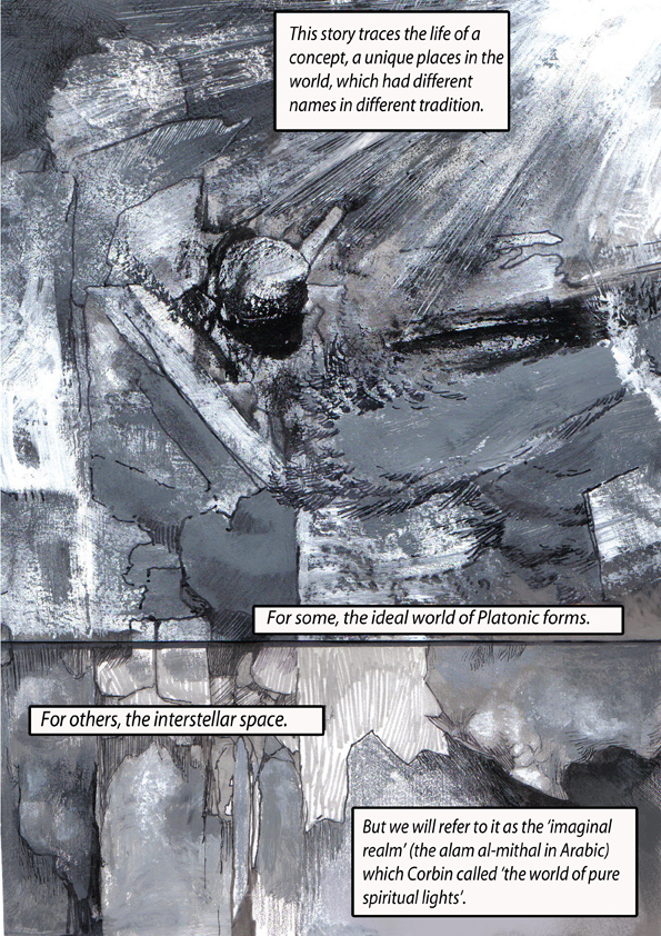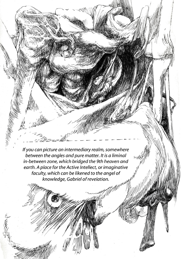 ‘Alam al-Mithal is my zine about the ‘world of images’ (likened to the world of Platonic forms), which existed as a type of threshold between heaven and earth in premodern Islamic cosmologies. It attempts a mythopoeic history, encompassing allegorical verses of the Quran, the miracles of the Prophet, Sufi imagery, the symbolic tropes of Urdu poetry and other historical sources. The story ends with the rise of European colonial power and the beginnings of modernization (and scientism) in the nineteenth century.